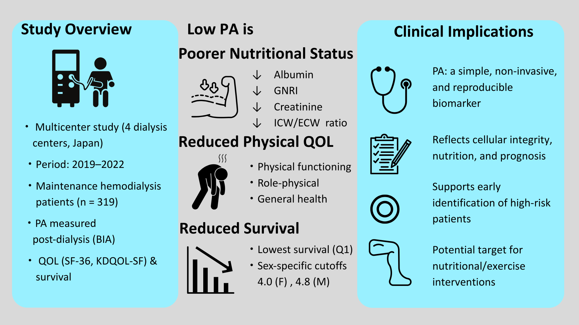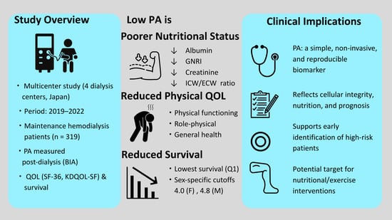 Yoshida, N.; Tanaka, T.; Suzuki, Y.; Takahashi, S.; Hitaka, M.; Ishii, S.; Yamazaki, K.; Ohashi, Y. Clinical Significance of Phase Angle for Assessing Quality of Life and Prognosis in Hemodialysis Patients. Nutrients 2025, 17, 3631. https://doi.org/10.3390/nu17233631