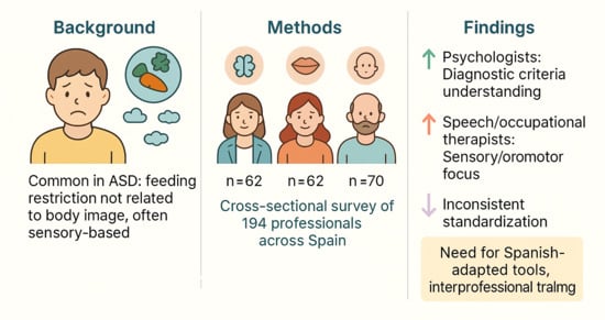 - Burrell, T.L.; Sharp, W.G.; Gillespie, S.; Pickard, K.; Brasher, S.; Buckley, D.; Scahill, L. A Survey of Community Providers on Feeding Problems in Autism Spectrum Disorder. J. Autism Dev. Disord. 2025, 55, 2000–2008. [Google Scholar] [CrossRef]