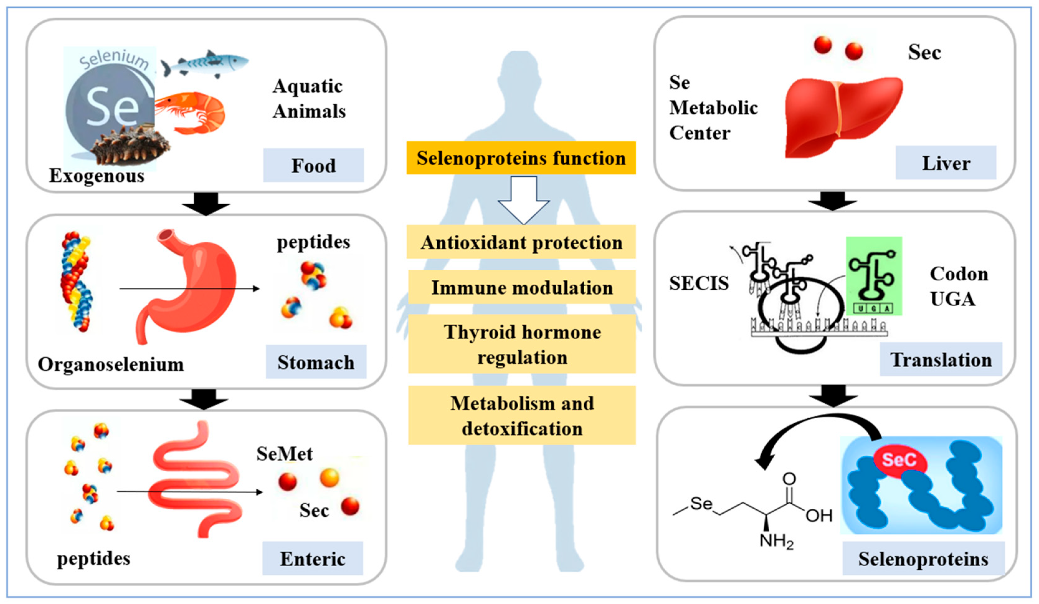 - Li, Z.-M.; Wang, X.-L.; Jin, X.-M.; Huang, J.-Q.; Wang, L.-S. The effect of selenium on antioxidant system in aquaculture animals. Front. Physiol. 2023, 14, 1153511. [Google Scholar] [CrossRef] [PubMed]