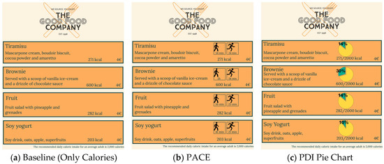 Similarly, the PDI pie chart did not demonstrate superior performance compared to the standard numeric calorie count, consistent with the findings of [39]. One possible explanation, as suggested by [40], is that respondents may not have understood how to use the pie charts to judge the amount of calories relative to recommended intakes.