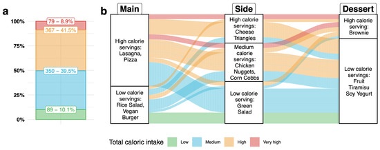 Plot ((a); left): Histogram showing the prevalence of the four levels of calorie intake corresponding to participants’ selected meals. Plot ((b); right): Alluvium plot illustrating the distribution of participants’ choices for each of the three courses as well as across courses, coloring meals by their calorie level.