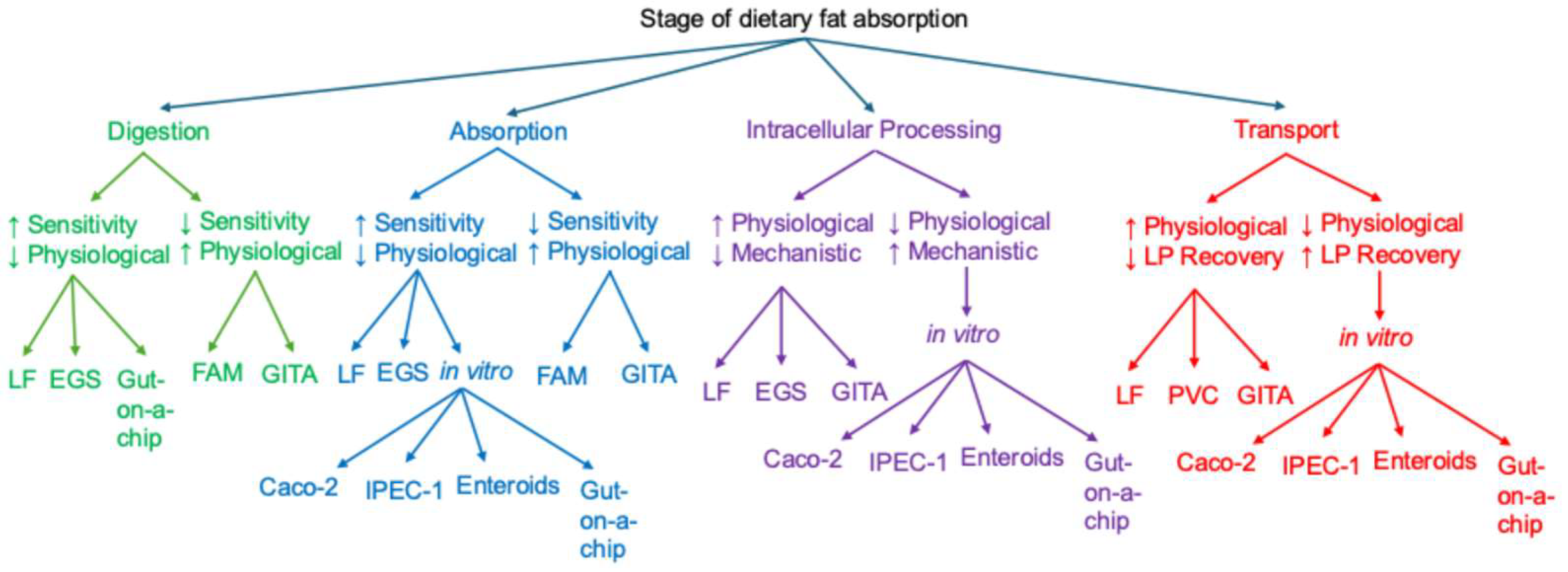 | Gut-on-a-chip | Can be designed to address a specific research question | Lack physiological complexity; not widely used yet for studying dietary fat absorption | Can be designed to study the mechanistic interaction of dietary fat absorption and other process | Isolated lipoproteins should be confirmed biochemically and microscopically [91,92] |