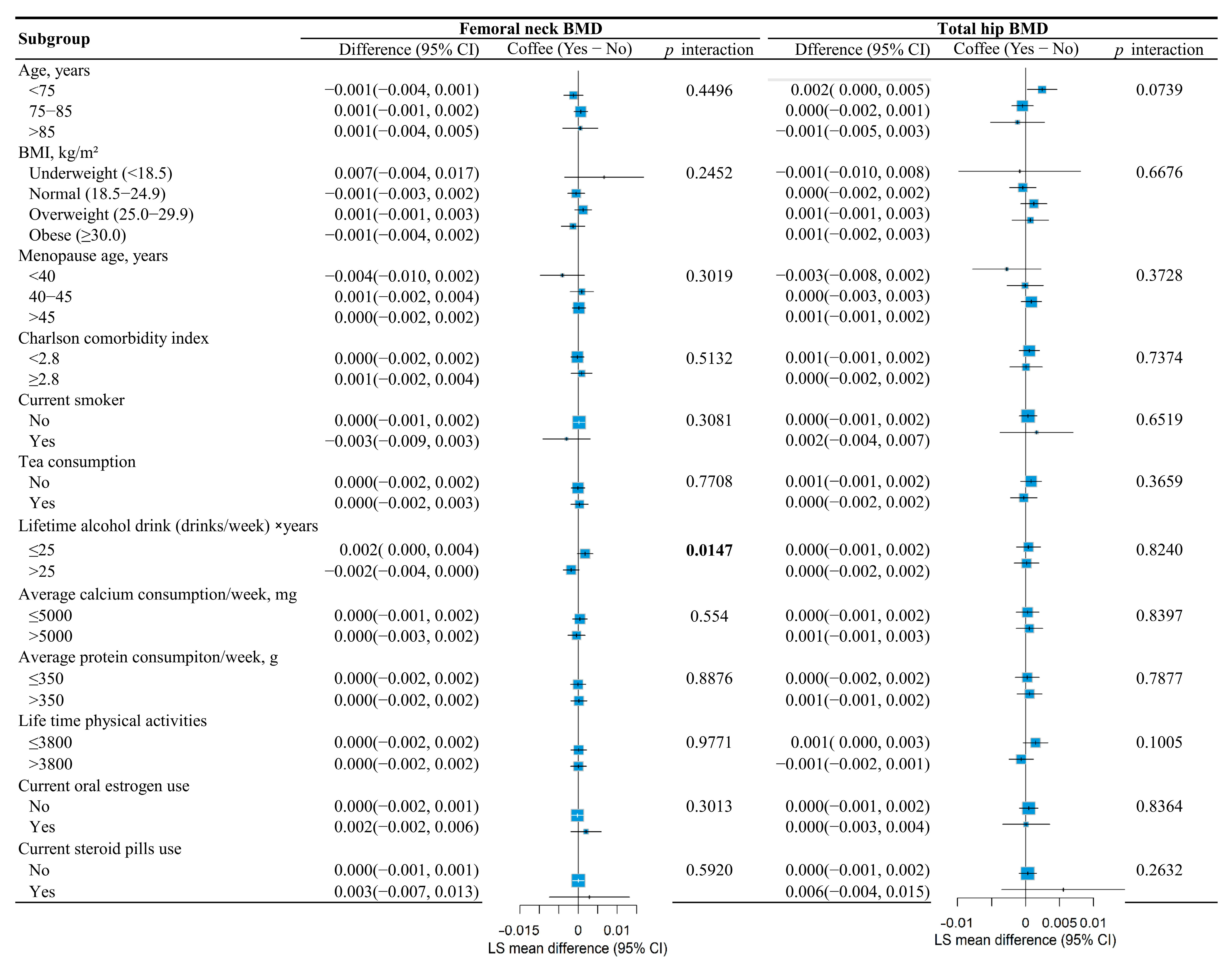 - Zhang, S.; Wu, S.; Xia, B.; He, Q.; Mi, N.; Zhao, J.; Hu, L.; Wang, D.; Zheng, L.; Sheng, P. Association of coffee and tea consumption with osteoporosis risk: A prospective study from the UK biobank. Bone 2024, 186, 117135. [Google Scholar] [CrossRef] [PubMed]