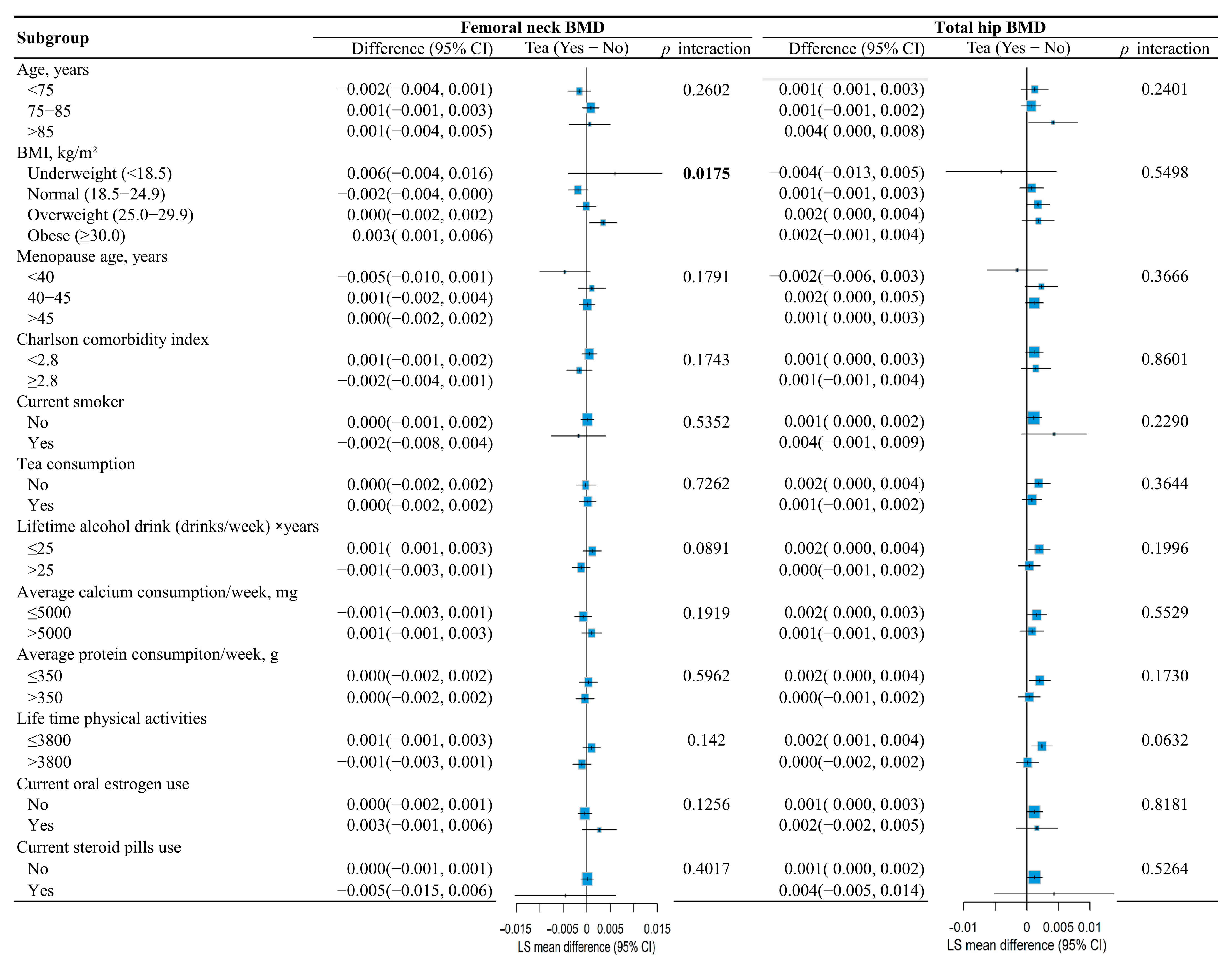 - Zhang, Z.-F.; Yang, J.-L.; Jiang, H.-C.; Lai, Z.; Wu, F.; Liu, Z.-X. Updated association of tea consumption and bone mineral density: A meta-analysis. Medicine 2017, 96, e6437. [Google Scholar] [CrossRef]