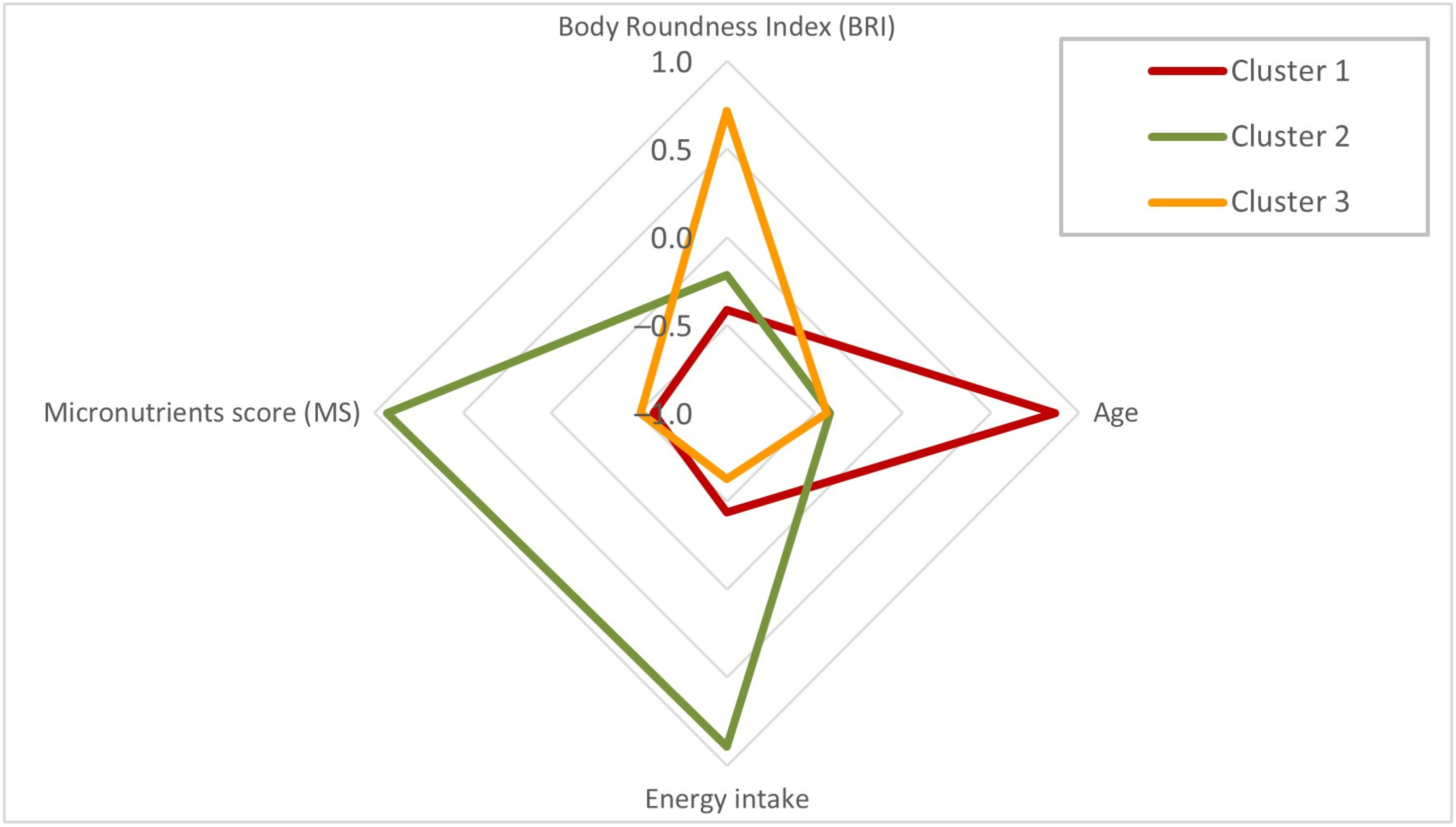 3.3. BRI Patterns, Age, Energy Intake, and Micronutrients Score by Clusters