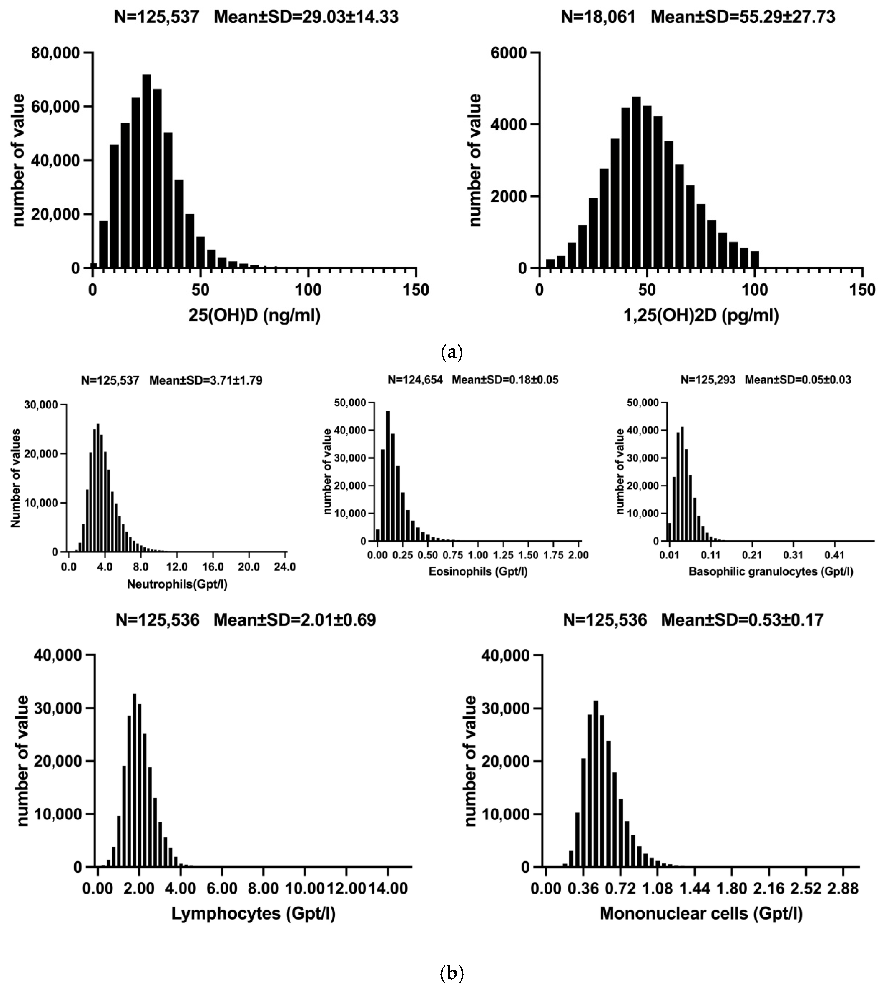 A total of 125,537 cases were included in this study, of which 77,903 (62.1%) were female. The mean age of the participants was 55.38 ± 17.69 years. The mean concentrations of the two vitamin D forms were as follows: 25(OH)D at 29.03 ± 14.33 ng/mL and 1,25(OH)