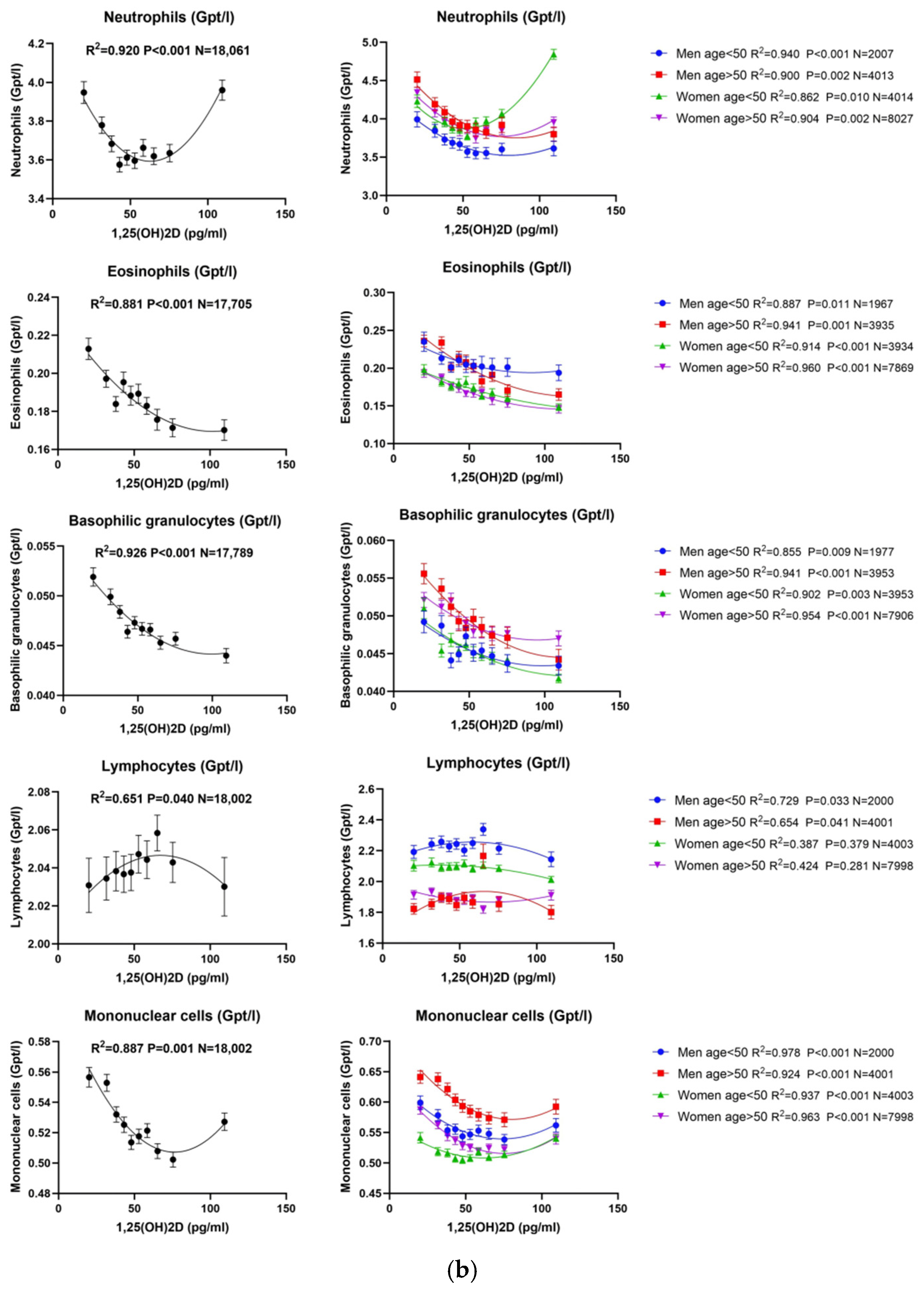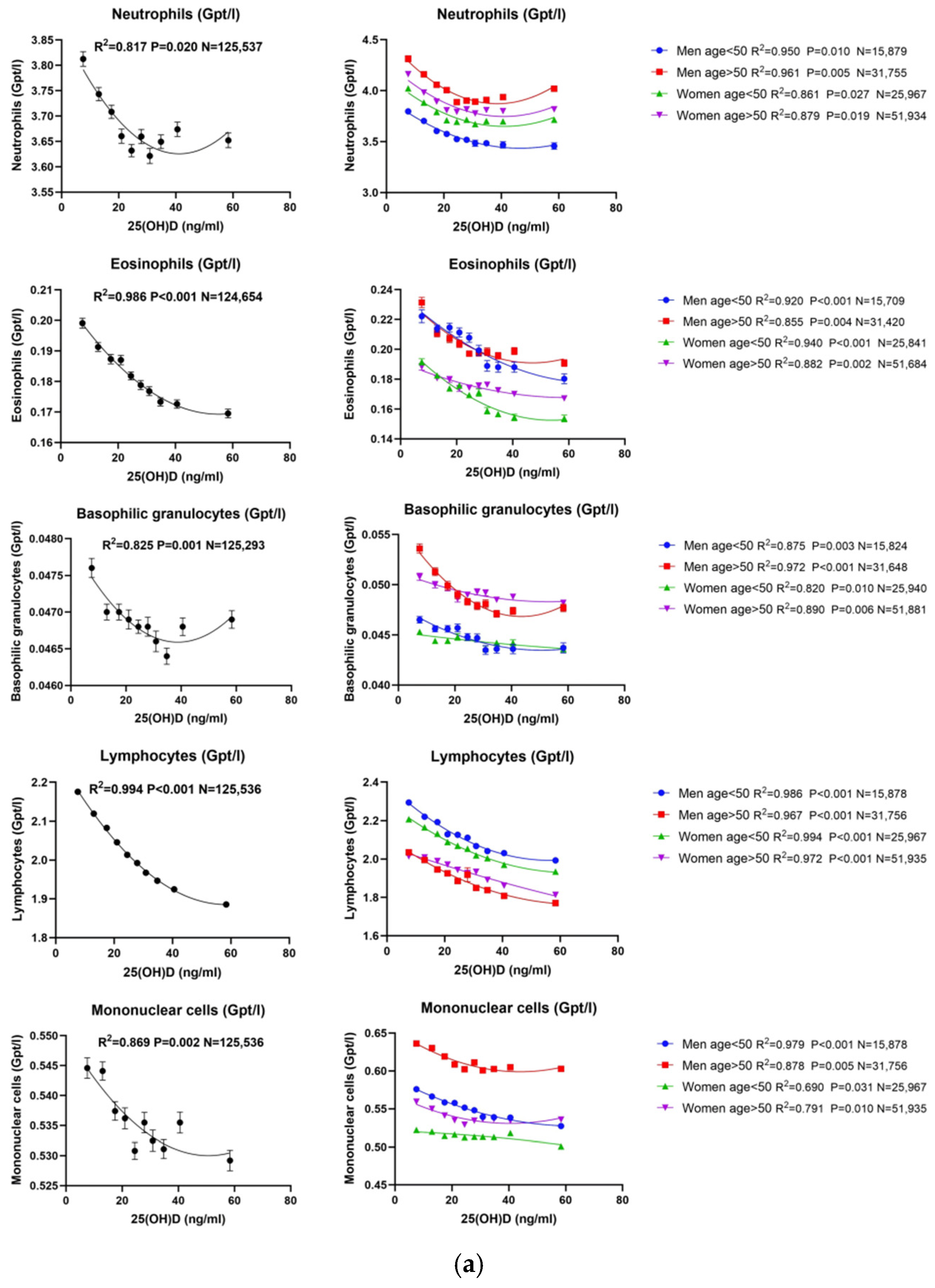 Figure 2a). Thus, both innate immune cells (neutrophils and monocytes) and adaptive/allergic-type cells (eosinophils, basophils, and lymphocytes) displayed distinct nonlinear or inverse relationships with vitamin D. For 1,25(OH)