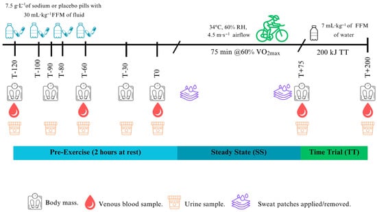Participants’ height (m; Holtain Limited, Crymych, UK), body mass (kg; TANITA Ingleburn, Australia), body fat (%), and fat-free mass (kg; Lunar iDXA; GE Healthcare, Waukesha, WI, USA) were measured to determine appropriate fluid and sodium dosage. Participants then performed a progressive incremental cycling test to exhaustion in temperate laboratory conditions (~21 °C; ~40% relative humidity (RH)) to determine VO2peak [] and the exercise intensity for steady-state cycling during the experimental sessions. The test was completed on a LODE bike (Excalibur Sport, Groningen, The Netherlands) using a calibrated Moxus Modular Metabolic cart (AEI Technologies, Inc., Bastrop, TX, USA). After a 30 min rest, participants completed one familiarisation session of a simulated 200 kJ cycling TT in temperate conditions.
