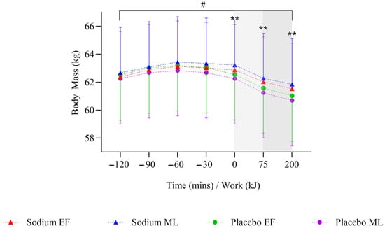 Mean change in body mass after two hours of hyperhydration at rest, during the steady state cycling (75 min), and the 200 kJ cycling time trial in the heat, with sodium and placebo hyperhydration across the early-follicular and mid-luteal phases of the menstrual cycle (n = 12). Linear mixed model included ‘intervention’, ‘phase’, and ‘time’ (categorical) and all possible interactions as fixed effects. ** p < 0.001 between sodium and placebo regardless of menstrual cycle phase. # p < 0.05 between sodium and placebo in the mid-luteal phase of the menstrual cycle. Shaded regions denote steady-state cycling (light grey) and the 200 kJ time-trial (dark grey).