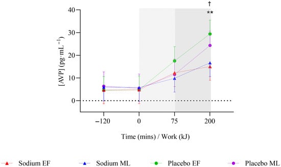 Mean change in arginine vasopressin hormone concentration after two hours of hyperhydration at rest, during the steady state cycling (75 min), and the 200 kJ cycling time trial in the heat, with sodium and placebo hyperhydration across the early-follicular and mid-luteal phases of the menstrual cycle (n = 12). EF: early follicular phase; ML: mid-luteal phase. Linear mixed model included ‘intervention’, ‘phase’, and ‘time’ (categorical) and all possible interactions as fixed effects. ** p < 0.001 between sodium and placebo, regardless of menstrual cycle phase. † p < 0.05 between sodium and placebo in the early-follicular phase of the menstrual cycle. Shaded regions denote steady-state cycling (light grey) and the 200 kJ time-trial (dark grey).
