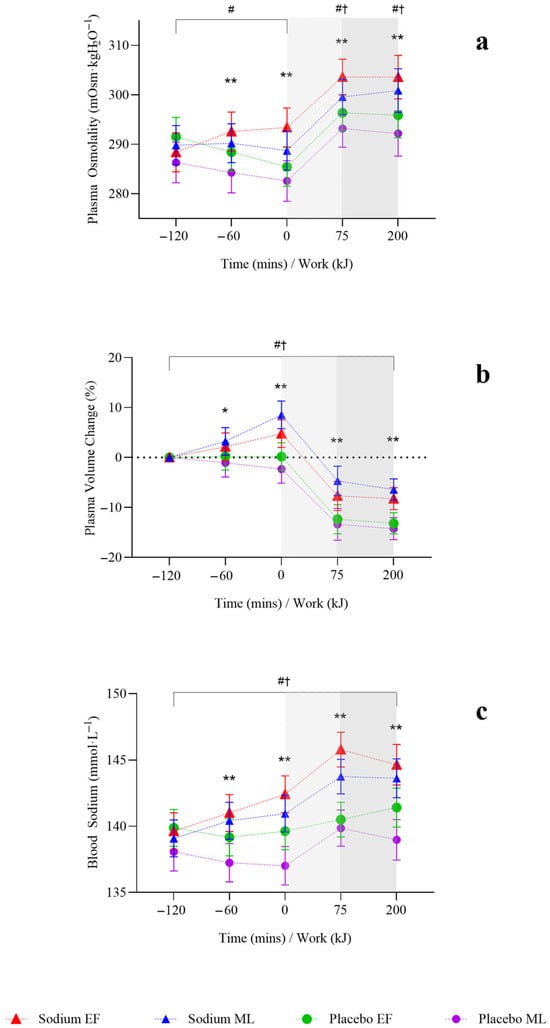 Hydration responses after two hours of hyperhydration at rest, during the steady state cycling (75 min), and the 200 kJ cycling time trial in the heat, with sodium and placebo hyperhydration across the early-follicular and mid-luteal phases of the menstrual cycle (n = 12). (a), Plasma osmolality; (b), plasma volume change; (c), blood sodium. EF: early follicular phase; ML: mid-luteal phase. Linear mixed model included ‘intervention’, ‘phase’, and ‘time’ (categorical) and all possible interactions as fixed effects. * p < 0.05 and ** p < 0.001 between sodium and placebo, regardless of menstrual cycle phase. † p < 0.05 between sodium and placebo in the early-follicular phase of the menstrual cycle. # p < 0.05 between sodium and placebo in the mid-luteal phase of the menstrual cycle. Shaded regions denote steady-state cycling (light grey) and the 200 kJ time-trial (dark grey).
