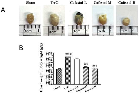 Effects of cafestol on cardiac morphology and weight parameters under different experimental conditions. (A) Representative images of excised hearts from each group illustrate the morphological impact of cafestol treatment. (B) Quantitative analysis of heart weight-to-body weight ratios shows significant increases following TAC, consistent with hypertrophic remodeling. Cafestol administration at 2 mg/kg/day (Cafestol-L), 10 mg/kg/day (Cafestol-M), and 50 mg/kg/day (Cafestol-H) attenuated these elevations compared with the untreated TAC group. Experimental groups included sham-operated controls, TAC-only mice, and TAC mice treated with cafestol at the indicated doses. Data are presented as mean ± SD (n = 5 per group). Statistical comparisons were performed using one-way ANOVA followed by Tukey’s post hoc test. Normality and variance homogeneity were confirmed using the Shapiro–Wilk and Levene’s tests. Effect sizes (η2) and 95% confidence intervals (CI) were calculated to support interpretation. *** p < 0.001 vs. sham; ### p < 0.001 vs. TAC.