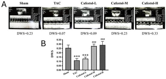 Impact of cafestol on cardiac function in a murine model of TAC-induced hypertrophy. (A) Representative echocardiographic images from each group illustrate alterations in cardiac performance following TAC and cafestol treatment. (B) Quantitative assessment of diastolic wall strain (DWS) revealed significant group differences. TAC surgery markedly reduced left ventricular ejection fraction compared with sham-operated controls, whereas cafestol administration at 2 mg/kg/day (Cafestol-L), 10 mg/kg/day (Cafestol-M), and 50 mg/kg/day (Cafestol-H) partially restored systolic function. DWS was calculated as [PWT(systole) − PWT(diastole)]/PWT(systole), serving as an index of left ventricular diastolic stiffness. Data are presented as mean ± SD (n = 5 per group). Statistical comparisons were performed using one-way ANOVA followed by Tukey’s post hoc test. Normality and variance assumptions were verified with the Shapiro–Wilk and Levene’s tests. Effect sizes (η2) and 95% confidence intervals (CI) were calculated to support interpretation. *** p < 0.001 vs. sham; ### p < 0.001 vs. TAC.