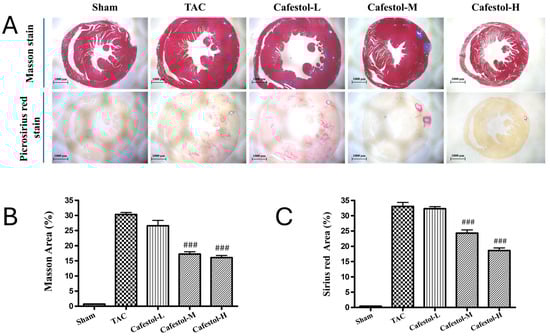 Histological examination of myocardial tissue revealed pronounced structural disruption in mice subjected to TAC. Masson’s trichrome and Sirius Red staining demonstrated extensive inflammatory infiltration, necrotic foci, and disorganized myocardial architecture in the TAC group, accompanied by substantial collagen accumulation indicative of fibrotic remodeling (Figure 3). Cafestol treatment markedly alleviated these pathological changes. Collagen deposition in the left ventricle was significantly reduced following cafestol administration, as reflected by a lower percentage of fibrotic areas, suggesting a protective effect against fibrosis. The reduction in collagen accumulation and preservation of myocardial architecture highlight the potential of cafestol to mitigate fibrotic progression in pressure overload-induced hypertrophy.