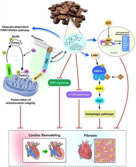 Schematic overview of cafestol’s mechanistic actions. This schematic illustrates the integrated molecular pathways through which cafestol safeguards cardiac function. Cafestol activates the liver kinase B1 (LKB1)–AMP-activated protein kinase (AMPK) –Unc-51 like autophagy activating kinase 1 (ULK1; mammalian homolog of autophagy-related protein 1 [Atg1]) axis and promotes PTEN-induced kinase 1 (PINK1)–Parkin–sequestosome 1 (p62)–mediated mitophagy, facilitating mitochondrial turnover and alleviating organelle stress. In parallel, cafestol enhances nuclear factor erythroid 2–related factor 2 (Nrf2)–driven antioxidant defenses. Upon oxidative stress, Nrf2 translocates into the nucleus and binds to the antioxidant response element (ARE), initiating transcription of antioxidant and cytoprotective genes including heme oxygenase-1 (HO-1), superoxide gismutase (SOD), catalase (CAT), glutathione peroxidase 1 (GPx1), NAD(P)H quinone dehydrogenase 1 (NQO1), glutathione S-transferase (GST), and Maf1 homolog (m1). Concurrently, cafestol suppresses extracellular signal-regulated kinase (ERK) and mammalian target of rapamycin (mTOR) signaling associated with fibrosis and endoplasmic reticulum stress. Collectively, these actions preserve mitochondrial integrity, limit collagen deposition, and attenuate cardiac hypertrophy and fibrosis. Ub denotes ubiquitin. Blue arrows denote activation; red hammer lines indicate inhibition; black arrows represent stimulation; and double arrows signify restoration of impaired signaling.