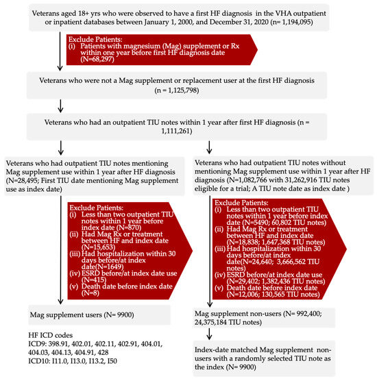 We emulated a target trial by “enrolling” eligible patients into the study cohort. The elements of the target trial and the emulation are summarized in Table 1. A patient would be qualified for inclusion in a trial if, on an outpatient clinical note date, they met the following criteria: (1) had the initial HF diagnosis within 1 year before, (2) had at least two outpatient clinical encounter notes within the previous 12 months (to confirm magnesium supplement use status), (3) had no records of prescribed or supplemental magnesium use prior to this date documented in the electronic medical records (EMR), (4) had no hospitalization within 30 days before or at the eligible date, and (5) had no end-stage-renal-disease (ESRD) any time before or at the eligible date. The purpose of requiring “no hospitalization within 30 days before or on the eligible date” was to exclude patients who were acutely ill, since these patients would be more likely to die earlier and have less opportunity to initiate magnesium supplements, thereby further reducing selection bias.