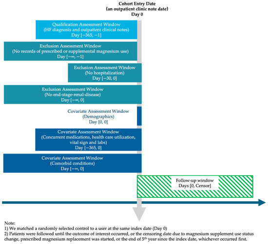 To assess the effects of magnesium supplementation, rigorously designed RCTs are ideal. However, RCTs are often expensive for a nutritional supplement, as they typically require large participant cohorts and extended follow-up periods to detect relatively small effect sizes [11,12,13]. Target trial emulation is designed to replicate the structure of an RCT on the observational data to evaluate clinical effectiveness while controlling the biases inherent to observational research [14,15,16,17]. This study aimed to assess the association between magnesium supplementation and all-cause hospitalization or death using a target trial emulation.