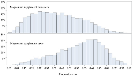 The propensity score distributions of magnesium supplement users and non-users are shown in Figure 3, indicating adequate overlap and no violation of the positivity assumption. The mean and standard deviation of IPTWs were 1.01 ± 0.58 overall (0.99 ± 0.52 for non-magnesium users and 1.02 ± 0.62 for magnesium supplement users). The ASD values for all measured baseline characteristics in the weighted cohort were below 10%, indicating balance after weighting (Table 3). The IPT-weighted pseudo-cohort had a mean age of 72.6 ± 11.1 years and comprised 12.6% African Americans, 3.3% Hispanics, and 3.4% women. Among these patients in the pseudo-cohort, 87.2% had hypertension, 33.9% had atrial fibrillation, 18.4% had myocardial infarction, and 12.7% had ischemic stroke. Furthermore, 14.5% and 31.5% of patients had a history of alcohol abuse and smoking, respectively. Overall, 39.8% of patients were treated with anti-diabetes medications and 77.1% with anti-hypertensive medications.