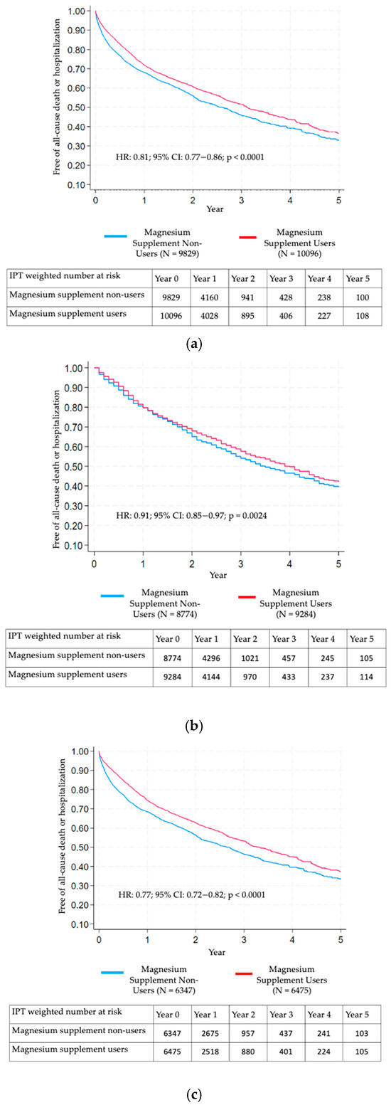 Similar associations were observed in the sensitivity analyses of the subgroup who survived at least 6 months (n = 17,959; HR: 0.91; 95% CI: 0.85–0.97; p = 0.0024, Figure 4b) from the index date and in the restricted cohort who had at least one more clinic visit note during follow-up confirming sustained magnesium supplement use along with their paired controls (n = 12,736; HR: 0.77; 95% CI: 0.72–0.82; p < 0.0001, Figure 4c).