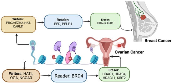 Altered histone codes in ovarian and breast cancer. Epigenetic regulation of chromatin involves three classes of protein. Writers (protein that add modifications), readers (proteins that recognize and interpret these modifications), and erasers (enzymes that remove them). Dysregulation of these enzymes alters gene expression and contributes to breast and ovarian cancer. The arrows indicate the sequential progression of the epigenetic regulations. Created in https://BioRender.com (accessed on 11 September 2025).