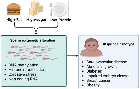 Imbalanced paternal macronutrient intake such as diets high in fat and high sugar Western diet, low in protein, or excessive high protein processed meats (bodybuilder foods), along with high caloric intake and early dietary exposures play a vital role in influencing sperm epigenetics and offspring health (Figure 3). Studies show that dietary imbalances disrupt sperm through epigenetic mechanisms, impacting not only fertility but also the developmental trajectory and long-term disease risk of descendants. High sugar diet impairs sperm motility and fertilization, contributes to adverse embryonic and offspring phenotypes, and intensifies oxidative stress [121], which works in hand with high fat diet [121]. Hyperglycemia and high-glycemic load exposure aggravate ROS and epigenetic instability, linking diet-induced glucose dysregulation to male infertility and intergenerational metabolic issues [121]. Similarly, high fat diet consistently induces significant changes in sperm DNA methylation, including global hypomethylation and imprinting errors (notably at IGF2 DMRs—Differentially Methylated Region) [122], also affecting histone acetylation and the exchange of histones for protamine, leading to less condensed chromatin that is susceptible to oxidative damage. These diets alter small RNA content, tsRNAs, miRNAs, lncRNA, and RNA modifications such as m6A. Paternal high fat diets increase reactive oxygen species (ROS) and DNA fragmentation [123], alter the composition and microbiota of seminal plasma, and disrupt the blood–testis barrier [122,123]. The consequences range from reduced sperm motility [123] and viability to delayed embryo development, fewer blastocyst cells, and implantation failure [123]. In offspring, metabolic syndrome traits such as insulin resistance, β-cell dysfunction, and obesity manifest alongside reproductive subfertility, neurobehavioral changes like increased anxiety and impaired learning, cardiovascular disease, and elevated cancer susceptibility. Many of these outcomes persist into the F2 generation, supporting the concept of “inherited metabolic memory [124].”.