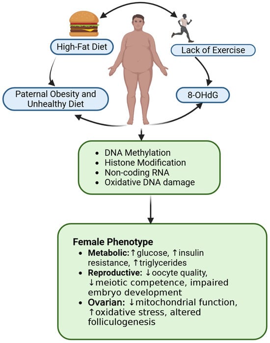 Mechanistic schema on how paternal obesity influences female reproductive health. These molecular alterations are passed on during fertilization, leading to compromised early embryonic development such as delayed cell cycles, and subsequent intergenerational health risks. 8-OHdG is 8-hydroxy-2-deoxyguanosine, an oxidized form of DNA that is biomarker for oxidative stress and DNA damage. Upward arrows indicate an increase, and downward arrows indicate a decrease or low in the female phenotype. The arrow outside the box indicates directional flow of the figure. Created in https://BioRender.com (accessed on 11 September 2025).