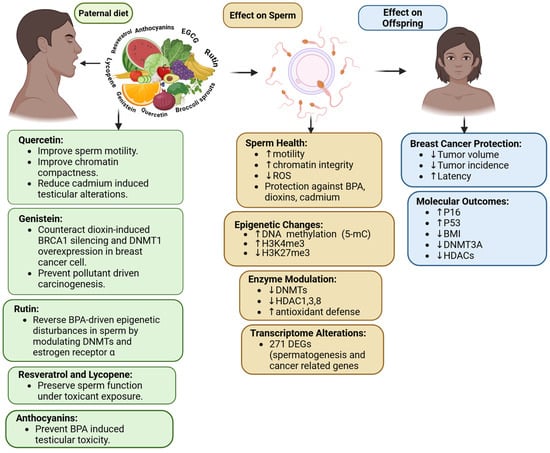 Paternal intake of phytochemical influence on sperm epigenetics. This includes changes in DNA methylation, histone modifications, enzyme activity, transcriptome, and sperm quality. These germline changes contribute to a reduced risk of breast cancer in their offspring by decreasing the incidence and tumor volume, delaying latency, and modulating genes associated with tumors. Upward arrows indicate an increase, and downward arrows indicate a decrease in the outcome. Created in https://BioRender.com (accessed on 11 September 2025).