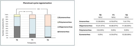 Menstrual cycle regularization over the treatment period. The chart reports the distribution of the menstrual cycle alteration over the treatment period. Data are reported as percentage values at three different timepoints: T0 (baseline), T1 (3 months of treatment), and T2 (6 months of treatment). p-values are described as follows: ** p < 0.01, and *** p < 0.001. Values in the table indicate the number of patients and the percentage of reference at each timepoint.