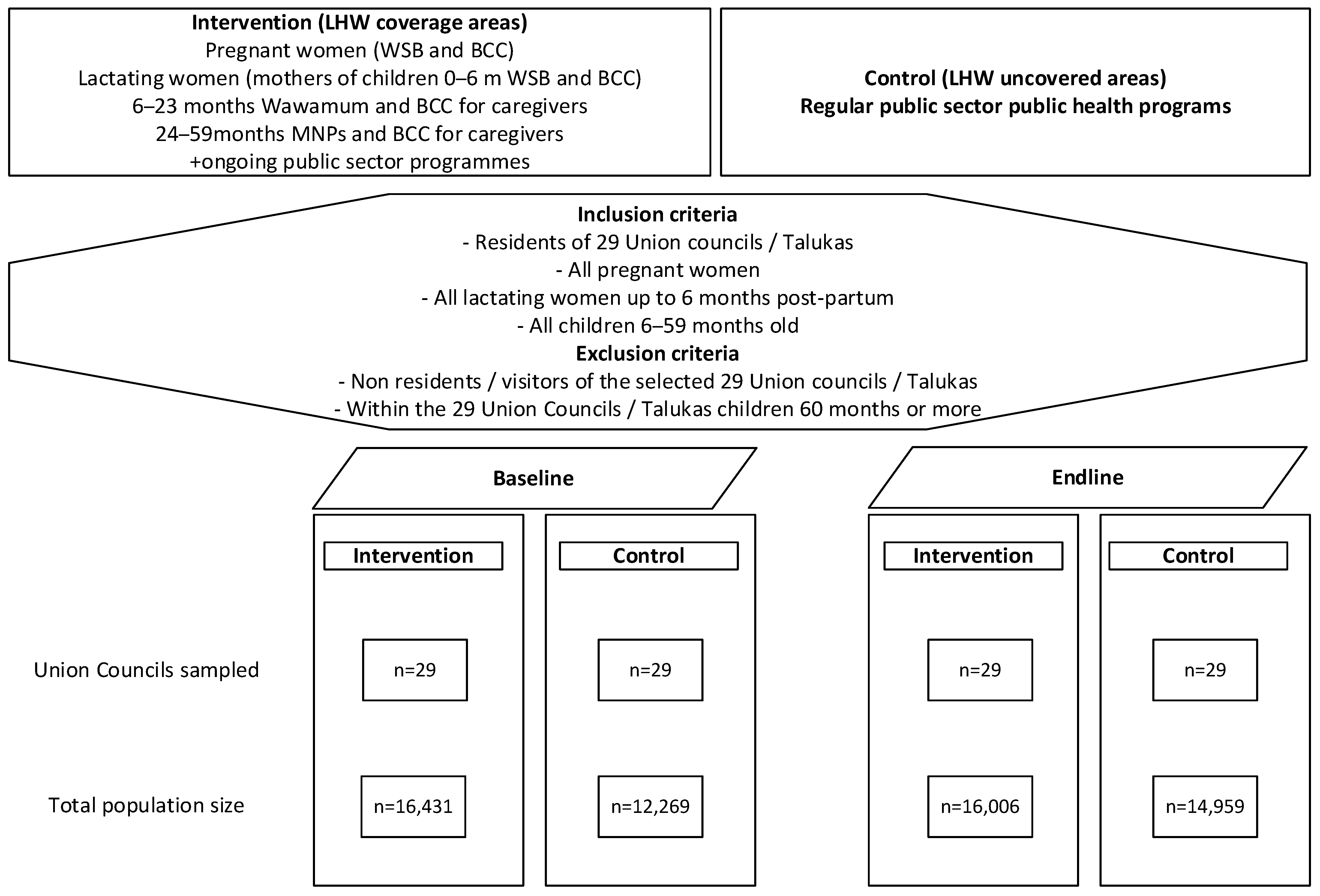 - Ashraf, K.; Huda, T.M.; Ikram, J.; Ariff, S.; Sajid, M.; Khan, G.N.; Umer, M.; Ahmed, I.; Dibley, M.J.; Soofi, S.B. The Effectiveness of Nutritional Interventions Implemented through Lady Health Workers on the Reduction of Stunting in Children under 5 in Pakistan: The Difference-in-Difference Analysis. Nutrients 2024, 16, 2149. [Google Scholar] [CrossRef]
