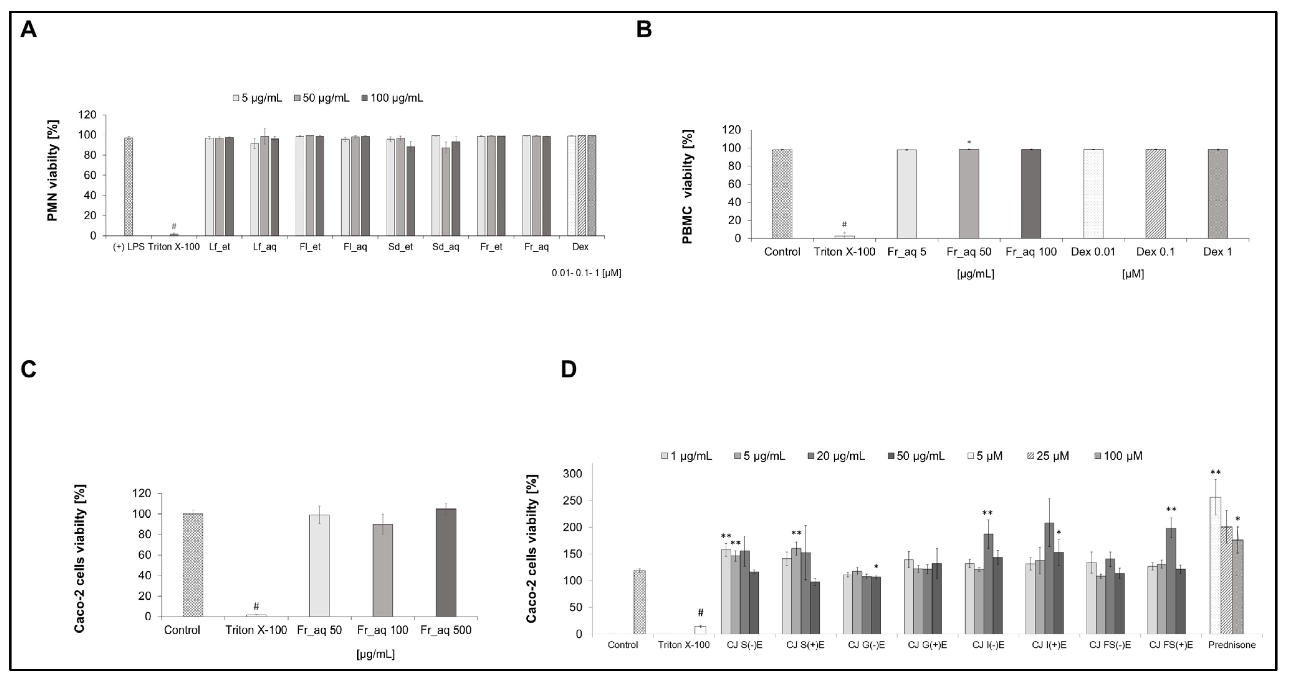 2.4. Cytokine Secretion in PMN, PBMC, and Caco-2