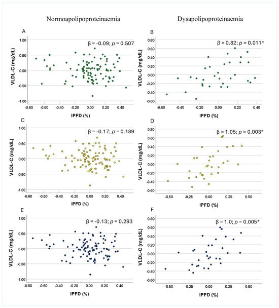 No significant association between IPFD and VLDL-C was observed in either the normoapolipoproteinaemia or dysapolipoproteinaemia subgroups of apo B, apo C-II, or apo C-III in Model 1 (Table 3). However, in Model 2, IPFD was significantly and positively associated with VLDL-C in the dysapolipoproteinaemia subgroups of apo B, apo C-II, and apo C-III, whereas no significant associations were observed in the corresponding normoapolipoproteinaemia subgroups (Table 3). Similarly, in Model 3, significant positive associations between IPFD and VLDL-C were observed in the dysapolipoproteinaemia subgroups, with each unit increase in IPFD corresponding to a 0.82-unit (p = 0.011), 1.05-unit (p = 0.003), and 1.00-unit (p = 0.005) increase in VLDL-C for apo B, apo C-II, and apo C-III, respectively (Figure 1B,D,E). In contrast, no significant associations were observed in any of the normoapolipoproteinaemia subgroups across unadjusted or adjusted models (Figure 1A,C,E).