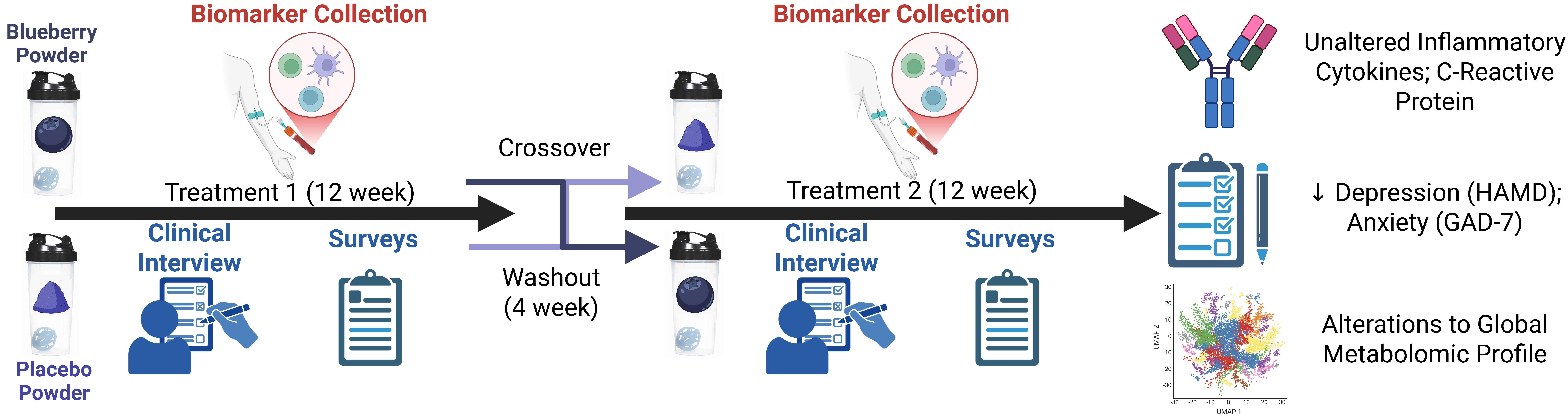 Overall, our behavioral results suggest a significant effect of 12 weeks of 24 g/day blueberry supplementation on clinical symptoms of depression and anxiety compared to a flavor- and color-matched placebo in participants from rural Louisiana. However, significant effects were not observed at 6 weeks. We also did not observe any treatment effects on pro- and anti-inflammatory cytokines or CRP, or correlations between biomarkers and symptoms. Interestingly, exploratory global metabolomics identified potential metabolite changes in the blueberry group. Importantly, this pilot study is the first of its kind conducted in the unique setting of rural health clinics, and these findings require further investigation and replication in larger populations to draw strong and generalizable conclusions. Within this limited context, our behavioral results support the hypothesis that blueberry supplementation is more effective than placebo in reducing symptoms of anxiety and depression.