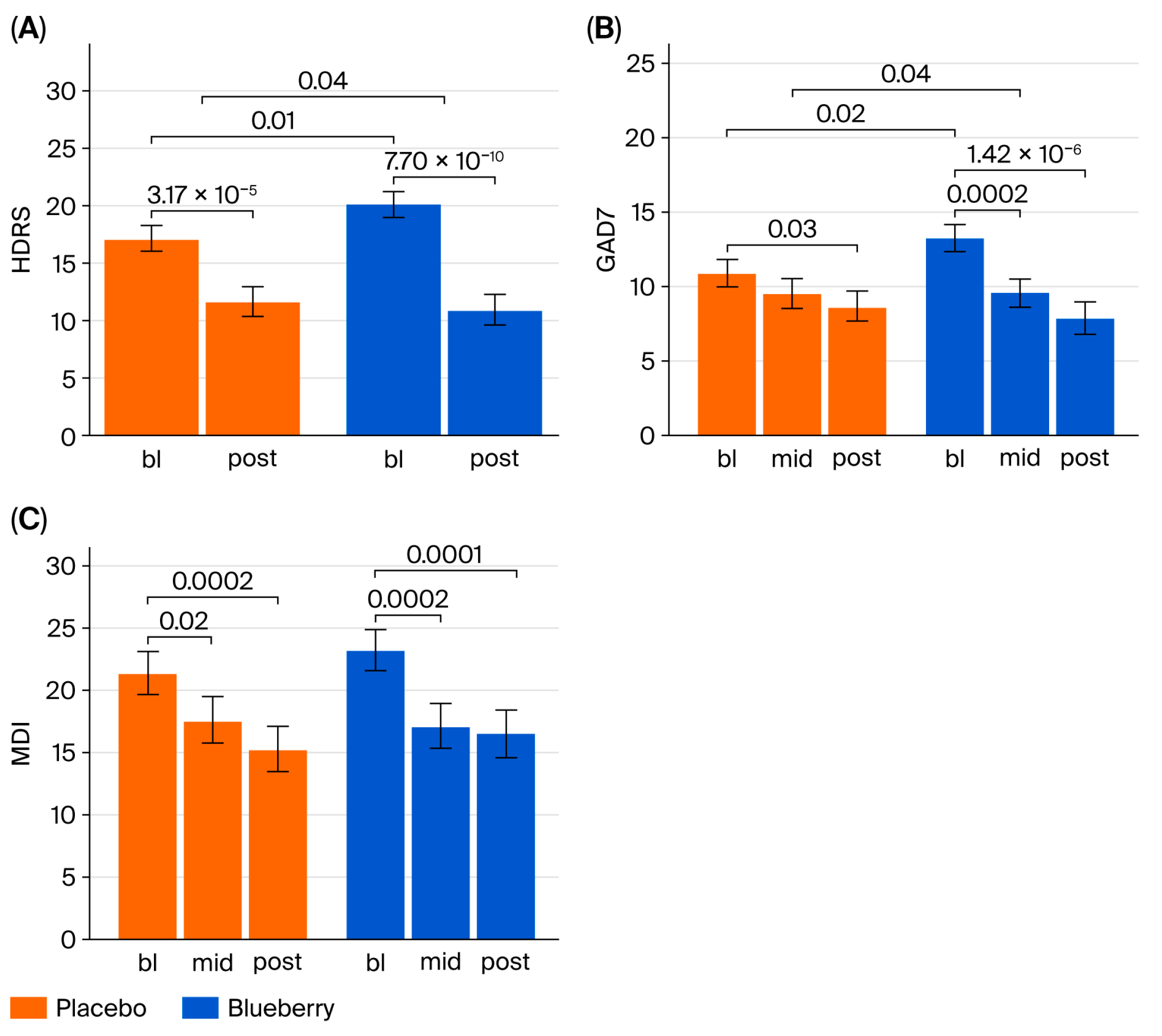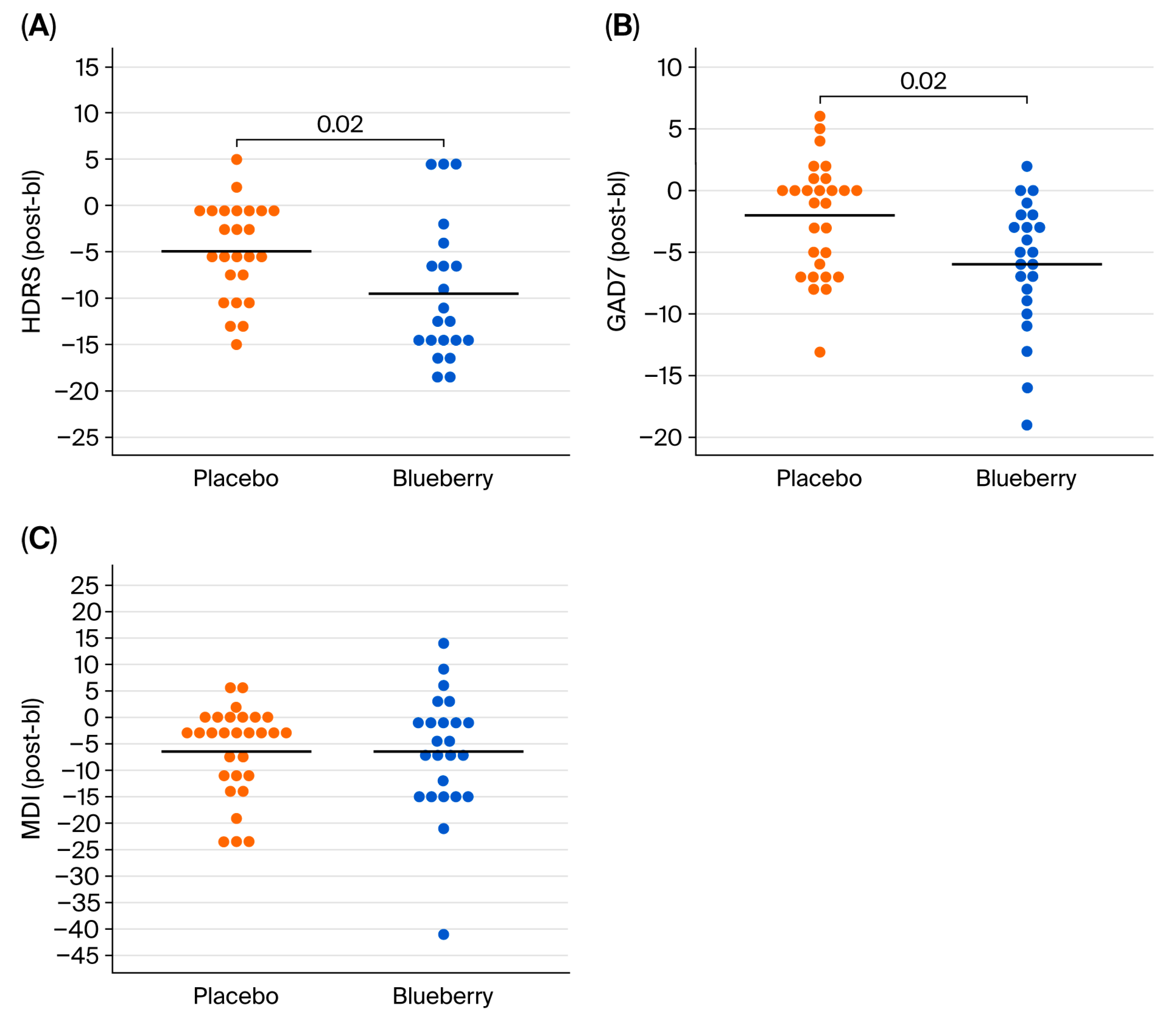 For behavioral data, HDRS, GAD-7, and MDI yield raw numerical scores (discrete variables); however, each raw score corresponds with a categorical score of symptom severity, which were summarized as frequency and percentages at each timepoint for both blueberry and placebo. No normalization or transformations were performed because data were normally distributed. For each behavioral measure, efficacy was evaluated in two ways: (1) intention to treat analysis, which utilizes raw scores from all timepoints, and (2) per protocol/completers analysis utilizing change scores calculated from bl to post. Completers analysis was performed by first calculating change scores between bl and post timepoints (post-baseline), which were pooled between BB-first and placebo-first groups, and analyzed using a paired
