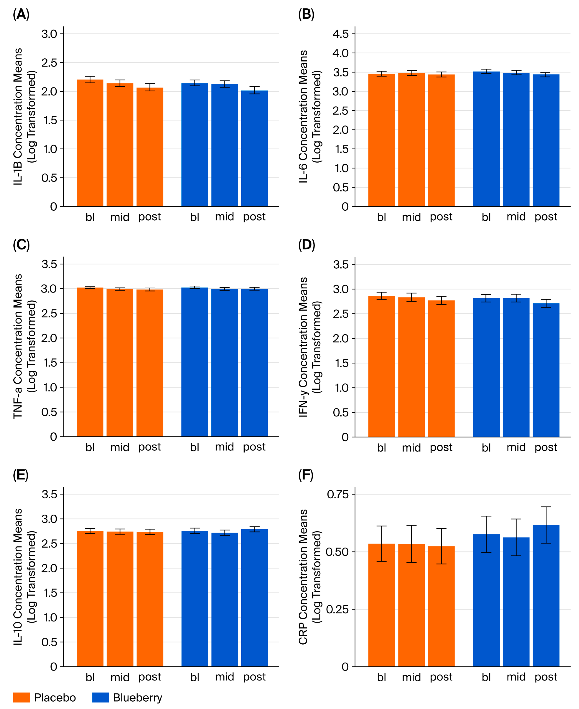 For inflammatory cytokine markers IL-1β, IL-6, TNF-α, IFN-γ, and IL-10, concentrations (fg/mL) were log-transformed to normalize distributions and outliers that were greater than 3 standard deviations from the mean were excluded from analysis. The simplest mixed-effects models for repeated measures (MEMRMs) that effectively represented the study design were selected and estimated using restricted maximum likelihood (REML). No unnecessary fixed effects or covariates were included. The response variable in each model was cytokine concentration (continuous variable); each cytokine was analyzed in a separate model. Fixed effects included appointment (categorical variable—bl, mid, post), treatment (categorical variable—blueberry or placebo), appointment x treatment interaction, period (categorical—Period 1 or Period 2), and sequence (categorical: blueberry first or placebo first), with the subject as a random effect. Models were fitted using the lmer function with variables defined as follows: bb_first = order; appt_cat = appointment; and de_id = subject identifier.