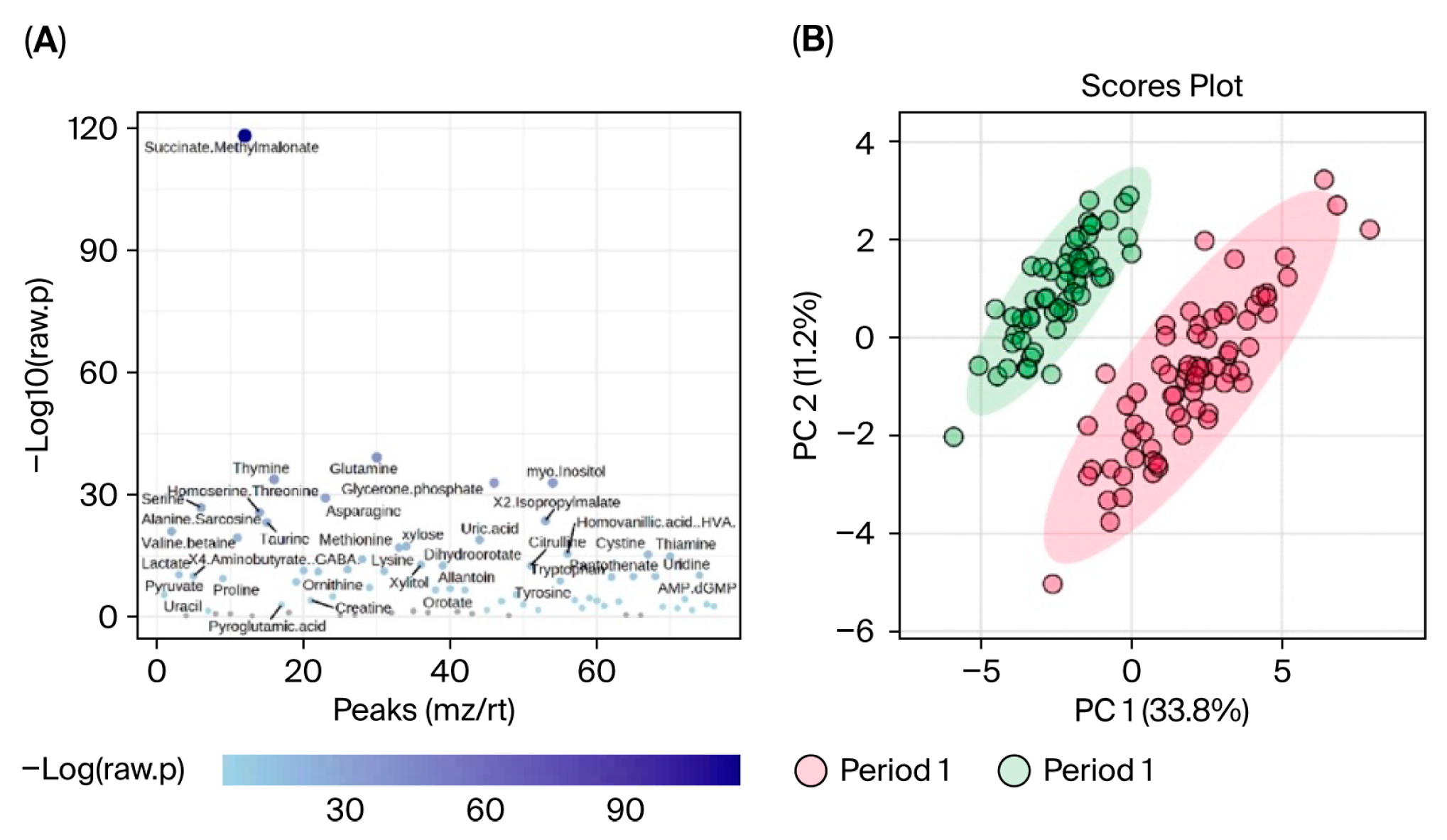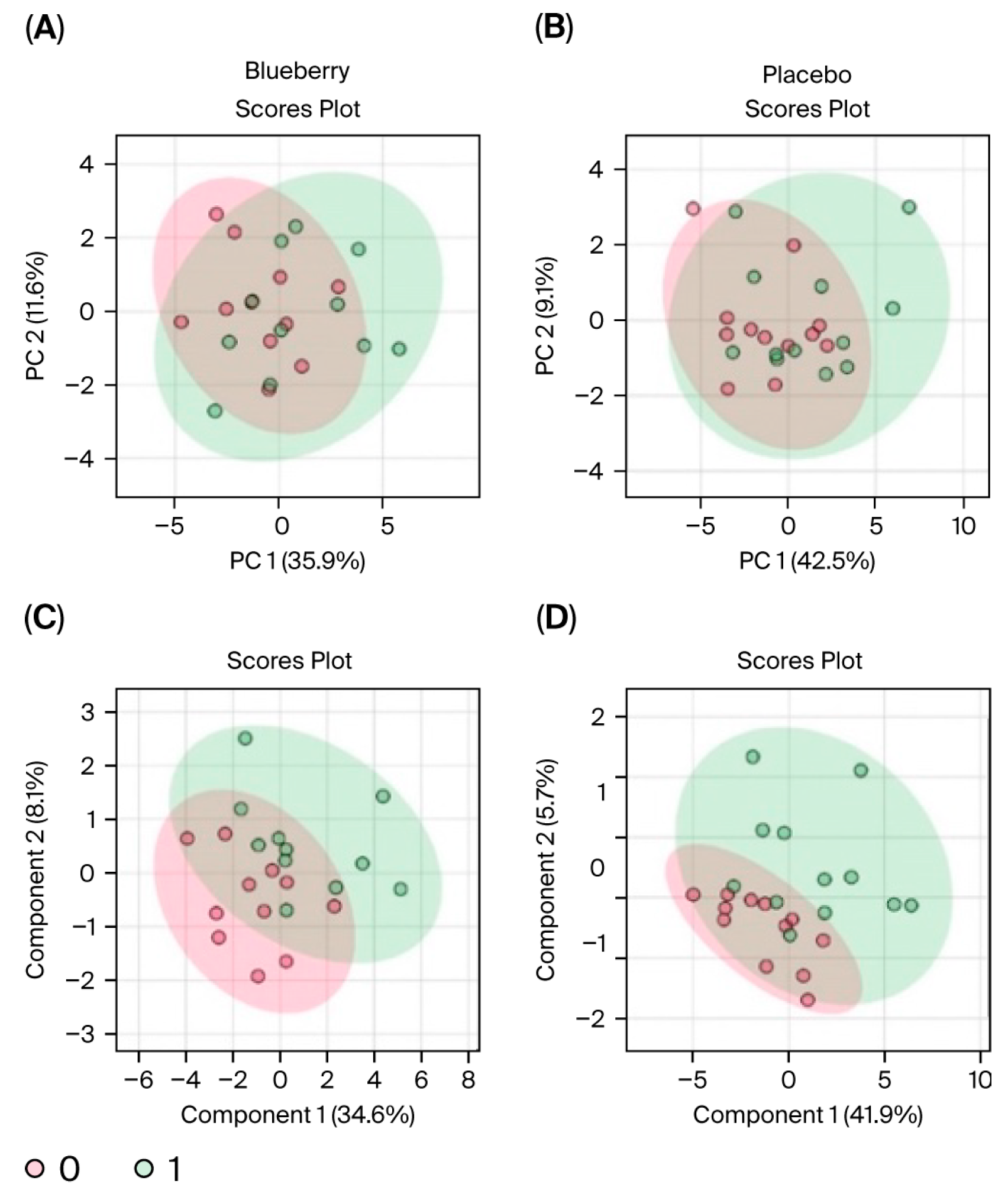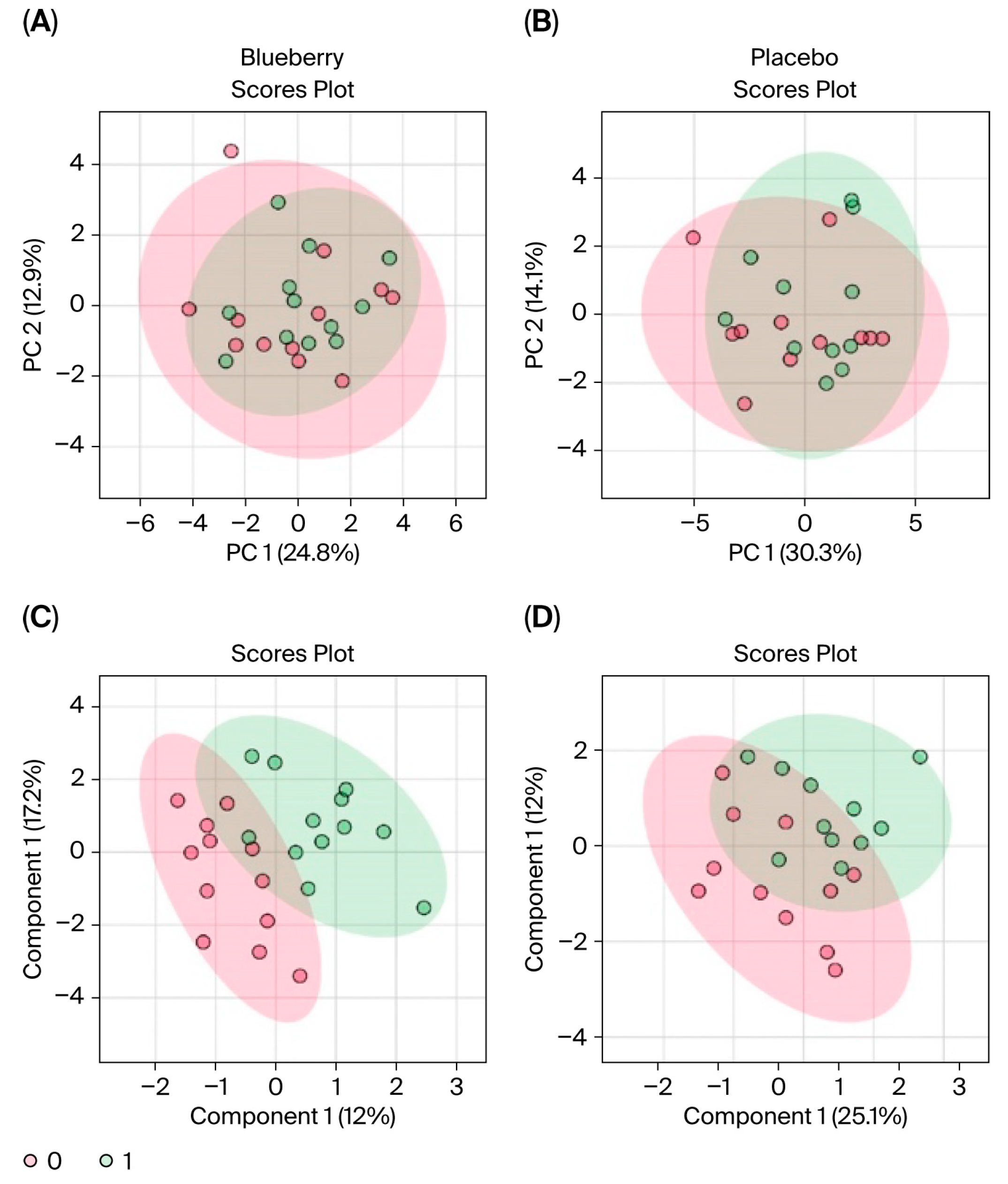 Data were first evaluated for period effects to determine if blueberry and placebo conditions between Period 1 and 2 could be pooled and analyzed together. Results indicated a significant period effect, with 65 out of 80 metabolites differing significantly (FDR < 0.05) between Period 1 and Period 2, and principal component analysis (PCA) revealed clear separation between the two periods (see