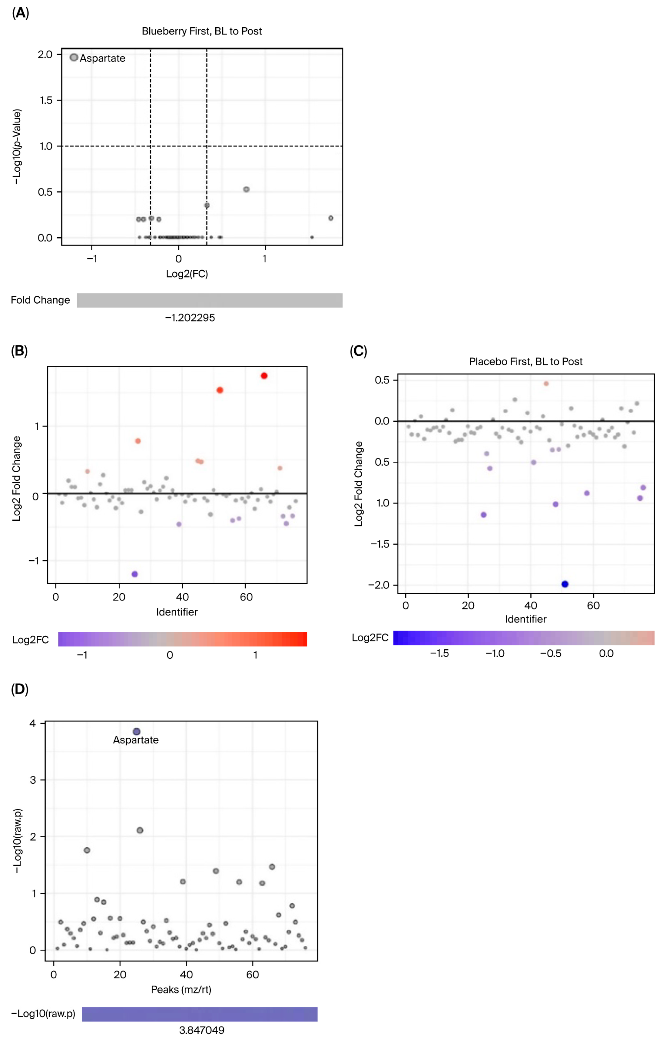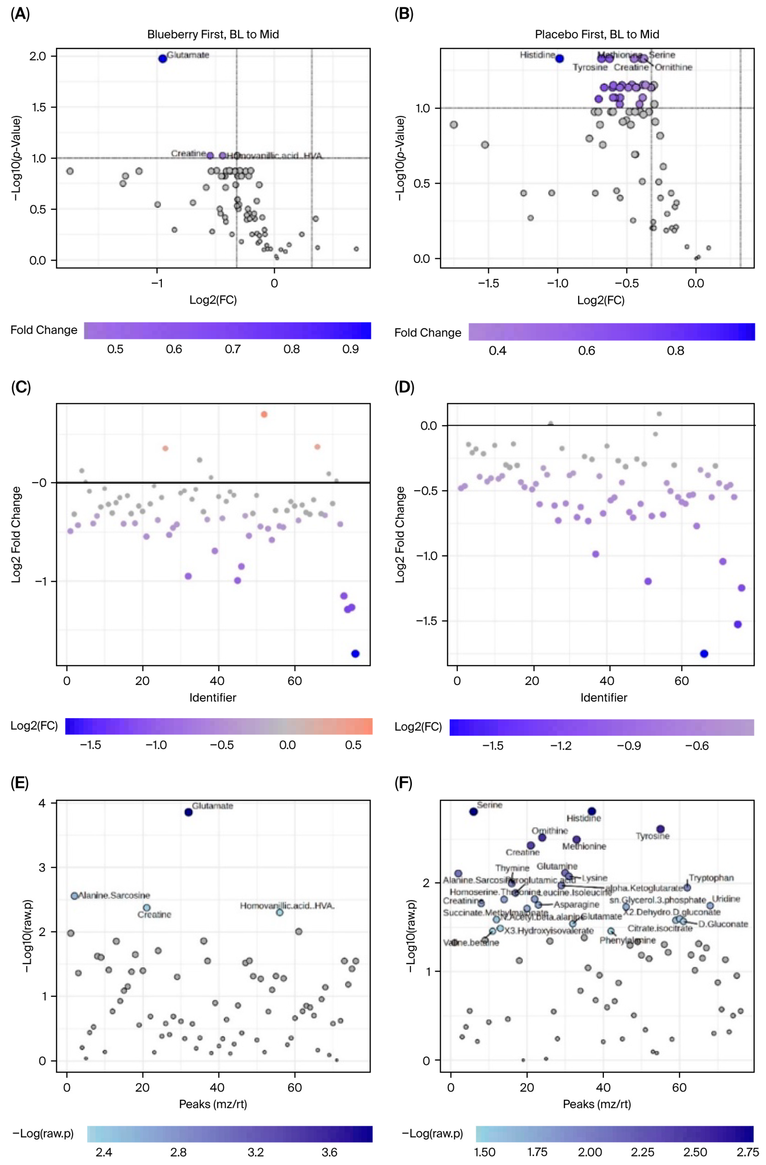 MetaboAnalyst software can only perform one-factor analysis and is unable to implement mixed-effects models to account for period effects. Therefore, analyses could not be carried out directly between blueberry and placebo conditions and only within each condition between timepoints (i.e., bl vs. mid, bl vs. post). Furthermore, because period effects were observed and could not be addressed statistically in MetaboAnalyst, only Period 1 data were included in our metabolomic analysis. Changes were evaluated via paired analyses for the (1) blueberry-first group from baseline (bl) to mid, (2) blueberry-first group from bl to post, (3) placebo-first group from bl to mid, and (4) placebo-first group from bl to post. Since this aspect of the study was exploratory and the use of only Period 1 significantly decreased statistical power, we opted to use detection parameters of 1.25 fold change (FC), which would indicate a 25% change, and an FDR < 0.1 which is less conservative than FDR < 0.05 but more informative than a raw