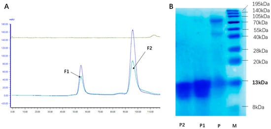The rhLYZ crude product was purified via gel filtration chromatography, during which peak P2 was identified as the rhLYZ elution peak, as confirmed by SDS-PAGE analysis (Figure 1A). Following concentration and desalting, the final product was obtained. The purity of this final product was quantified at 96.2% by densitometric analysis of a Coomassie Brilliant Blue-stained SDS-PAGE gel using Quantity One software (version 4.6.9; Bio-Rad Laboratories, Inc., Hercules, CA, USA), where purity was calculated as the integrated intensity ratio of the target rhLYZ band to all bands in the lane (Figure 1B). All rhLYZ used in subsequent experiments was derived from this purification process.
