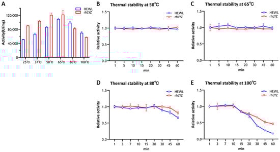 Optimal Temperature of rhLYZ and HEWL and thermal stability of rhLYZ and HEWL at 50 °C, 65 °C, 80 °C, and 100 °C. The results are expressed as SD ± mean, n = 3. (A) activity; (B) thermal stability at 50 °C; (C) thermal stability at 65 °C; (D) thermal stability at 80 °C; (E) thermal stability at 100 °C.