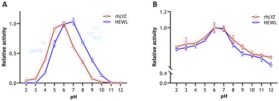 (A) Optimal pH of rhLYZ and HEWL; (B) pH stability of rhLYZ and HEWL. The results are expressed as SD ± mean, n = 3.