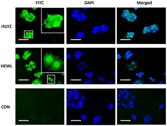 Fluorescently Labeled Lysozyme Acting on HT-29 Cells. FITC-labeled lysozyme was used to treat HT-29 cells, with FITC employed to label rhLYZ and HEWL, and DAPI for nuclear staining (scale bar = 20 μm).