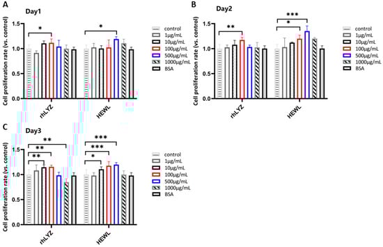 Effects of rhLYZ and HEWL on HT-29 cell proliferation. (A) Changes in cell proliferation rate after 1-day incubation with rhLYZ or HEWL; (B) Changes in cell proliferation rate after 2-day incubation with rhLYZ or HEWL; (C) Changes in cell proliferation rate after 3-day incubation with rhLYZ or HEWL. The results are expressed as mean ± SD, n = 5. The significance of the differences was estimated by one-way ANOVA, * p < 0.05, ** p < 0.01, *** p < 0.001.