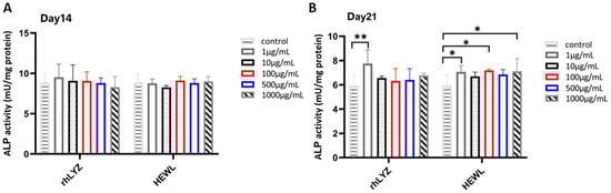 Effects of rhLYZ and HEWL on alkaline phosphatase (ALP) activity in HT-29 cells. (A) Changes in ALP activity after 14-day incubation with rhLYZ or HEWL; (B) Changes in ALP activity after 21-day incubation with rhLYZ or HEWL. The results are expressed as mean ± SD, n = 5. The significance of the differences was estimated by one-way ANOVA, * p < 0.05, ** p < 0.01.
