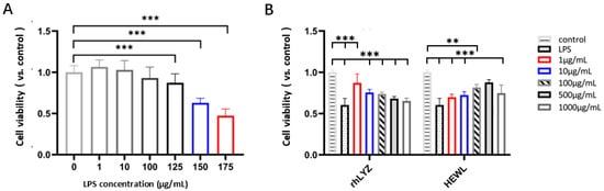 Protective effects of rhLYZ and HEWL on LPS-injured HT-29 cells. (A) Effect of LPS on HT-29 cell viability; (B) Protective effects of rhLYZ and HEWL on LPS-injured HT-29 cells. The results are expressed as mean ± SD, n = 5. The significance of the differences was estimated by one-way ANOVA, ** p < 0.01, *** p < 0.001.