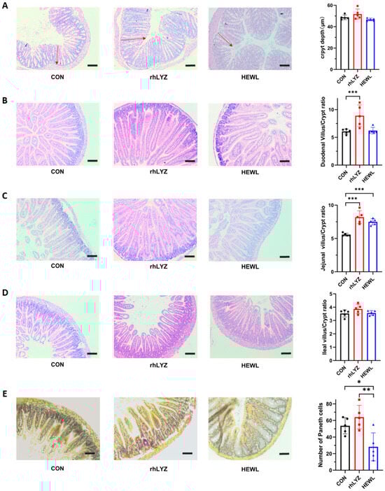 Intestinal sections in neonatal mice for the rhLYZ, HEWL, and CON groups. (A) Colon crypt depth; the red headed arrow indicates the crypt length. (B) Duodenal villus-to-crypt ratio; (C) Jejunal villus-to-crypt ratio; (D) Ileal villus-to-crypt ratio; (E) Paneth cell count in ileum (scale bar = 50 μm). The results are expressed as mean ± SD, n = 5. The significance of the differences was estimated by one-way ANOVA, * p < 0.05, ** p < 0.01, *** p < 0.001.