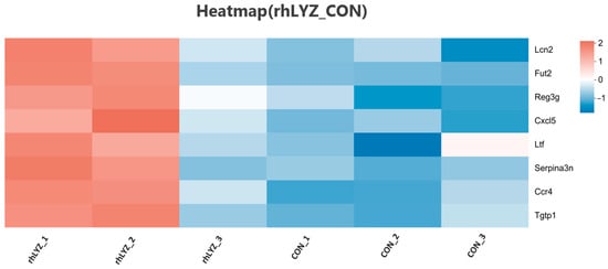 As shown in Figure 10A, all three sample groups exhibited distinct separation, with the HEWL group demonstrating substantial differences compared to both the rhLYZ and control (CON) groups. Differential expression analysis using edgeR further revealed only 37 differentially expressed genes (DEGs) between the rhLYZ and control groups, whereas 346 DEGs were identified between the HEWL and control groups. Notably, 1012 DEGs were detected between the rhLYZ and HEWL groups (Figure 10B). Consequently, 18-day rhLYZ gavage administration induced minimal alterations in small intestinal gene expression in mice, while HEWL significantly remodeled the transcriptional landscape. The markedly higher number of DEGs between rhLYZ and HEWL underscores their divergent biological effects.