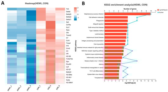 Analysis of immune-related differentially expressed gene sets in the neonatal mouse intestinal transcriptome of the HEWL vs. CON. (A) Cluster analysis of immune-related DEGs for HEWL vs. CON; The color scale represents normalized expression levels, with red indicating up-regulation and blue indicating down-regulation in the HEWL group compared to CON; (B) KEGG functional enrichment analysis of immune-related DEGs for HEWL vs. CON; The color gradient of the bars corresponds to the statistical significance of the enrichment (−log10(p-value)); n = 3.