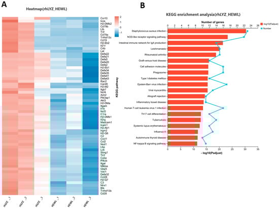 Analysis of immune-related differentially expressed gene sets in the neonatal mouse intestinal transcriptome of the rhLYZ vs. HEWL. (A) Cluster analysis of immune-related DEGs for rhLYZ vs. HEWL; (B) KEGG functional enrichment analysis of immune-related DEGs for rhLYZ vs. HEWL. n = 3.