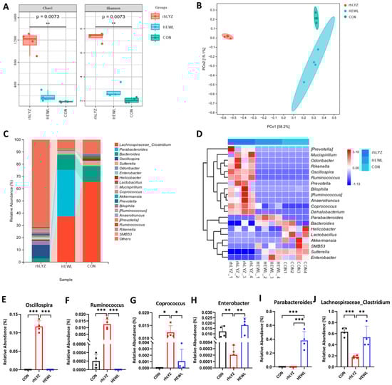 Effects of rhLYZ and HEWL on developing gut microbiota composition. (A) α-diversity (Chao1, Shannon); (B) β-diversity; (C) Genus-level composition; (D) Differential species heatmap; (E) Oscillospira abundance; (F) Ruminococcus abundance; (G) Coprococcus abundance; (H) Enterobacter abundance; (I) Parabacteroides abundance; (J) Lachnospiraceae_Clostridium abundance. The results are expressed as mean ± SD, n = 4. The significance of the differences was estimated by one-way ANOVA, * p < 0.05, ** p < 0.01, *** p < 0.001.