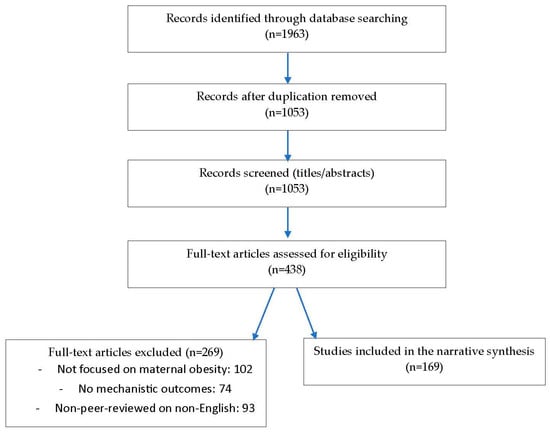 Studies were included if they met predefined criteria regarding study design, population, and scientific focus. Eligible study designs included randomized controlled trials, cohort studies, case–control studies, experimental animal studies, and systematic reviews. Populations of interest included pregnant women with obesity (defined as pre-pregnancy or gestational BMI ≥ 30 kg/m2) and their offspring, as well as validated animal models of maternal obesity. Studies were required to address mechanistic pathways—such as inflammation, oxidative stress, metabolic dysregulation, placental alterations, epigenetic modifications, microbiome changes, or breastfeeding-related mechanisms—or long-term maternal or offspring outcomes tied to such pathways. Exclusion criteria included non-English publications, non-peer-reviewed or gray literature (e.g., conference abstracts, dissertations, commentaries), and studies not directly related to maternal obesity or mechanistic pathways.