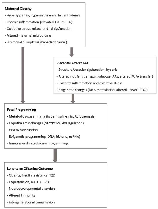 Maternal obesity influences offspring health primarily through fetal programming, a process in which early-life stimuli during critical developmental windows lead to lasting physiological changes [,]. This programming involves genetic and epigenetic modifications, such as DNA methylation, histone alterations, and non-coding RNA expression, as well as oxidative stress, inflammation, insulin resistance, placental dysfunction, and HPA axis (Hypothalamic–Pituitary–Adrenal axis) disruption [,]. These changes can alter gene expression related to metabolism, appetite regulation, and energy balance, increasing the risk of adiposity and impaired glucose tolerance later in life [,,,,]. Additionally, maternal obesity negatively affects fetal brain development through inflammatory and oxidative mechanisms, elevating the risk of neurodevelopmental disorders such as ADHD and autism and contributing to long-term cognitive and psychiatric challenges [,,].